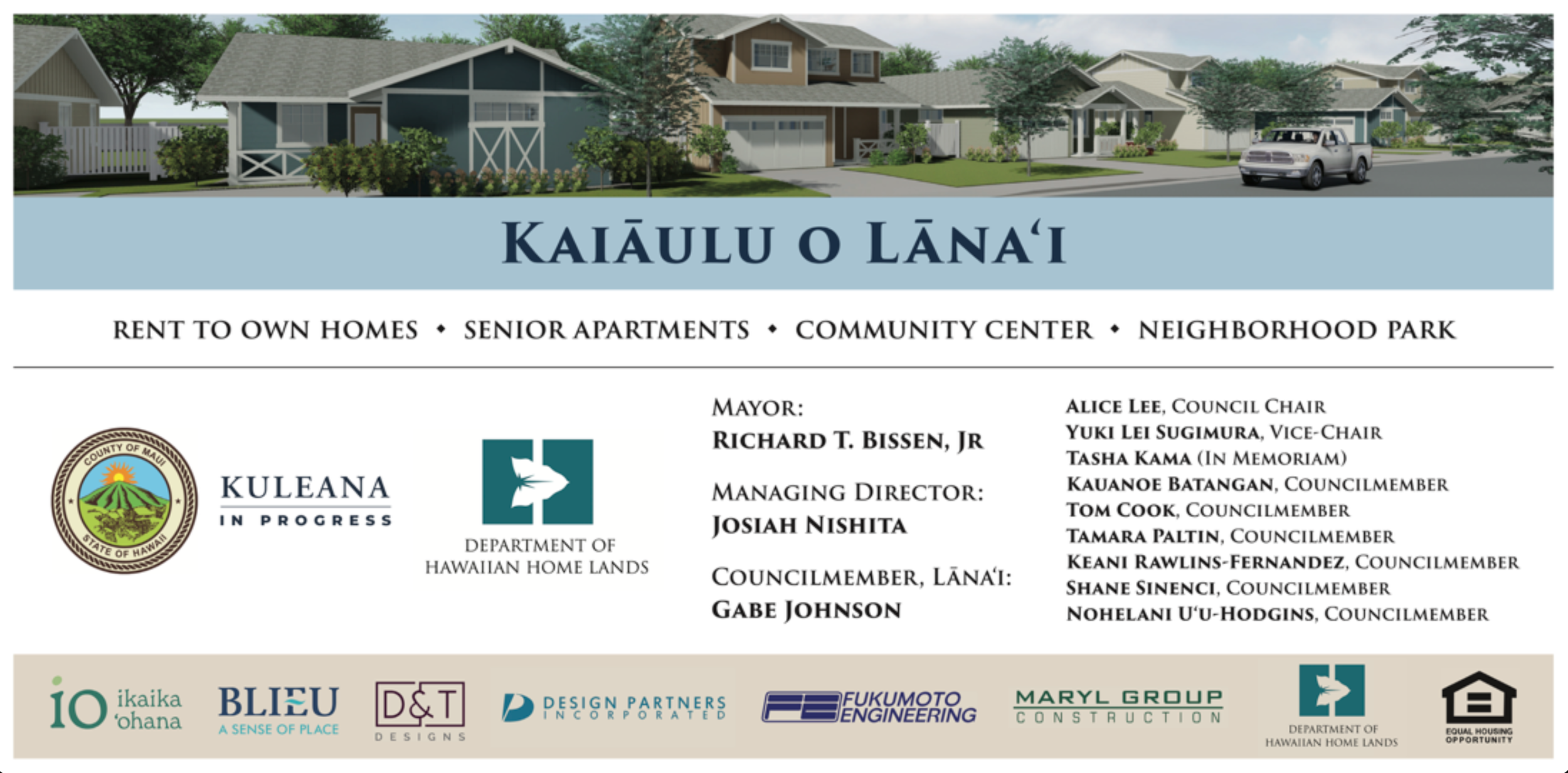 Ikaika ʻOhana, the nonprofit developer overseeing the project, has built and managed multiple affordable housing developments across Maui County, including rental and rent-to-own communities on Maui and Hawaiʻi Island. The organization works in partnership with counties and state agencies to layer financing, manage long-term compliance, and oversee on-site property management after construction. Their role on Lānaʻi includes development oversight, coordination of infrastructure planning, and long-term management of the rental and rent-to-own components once residents move in.